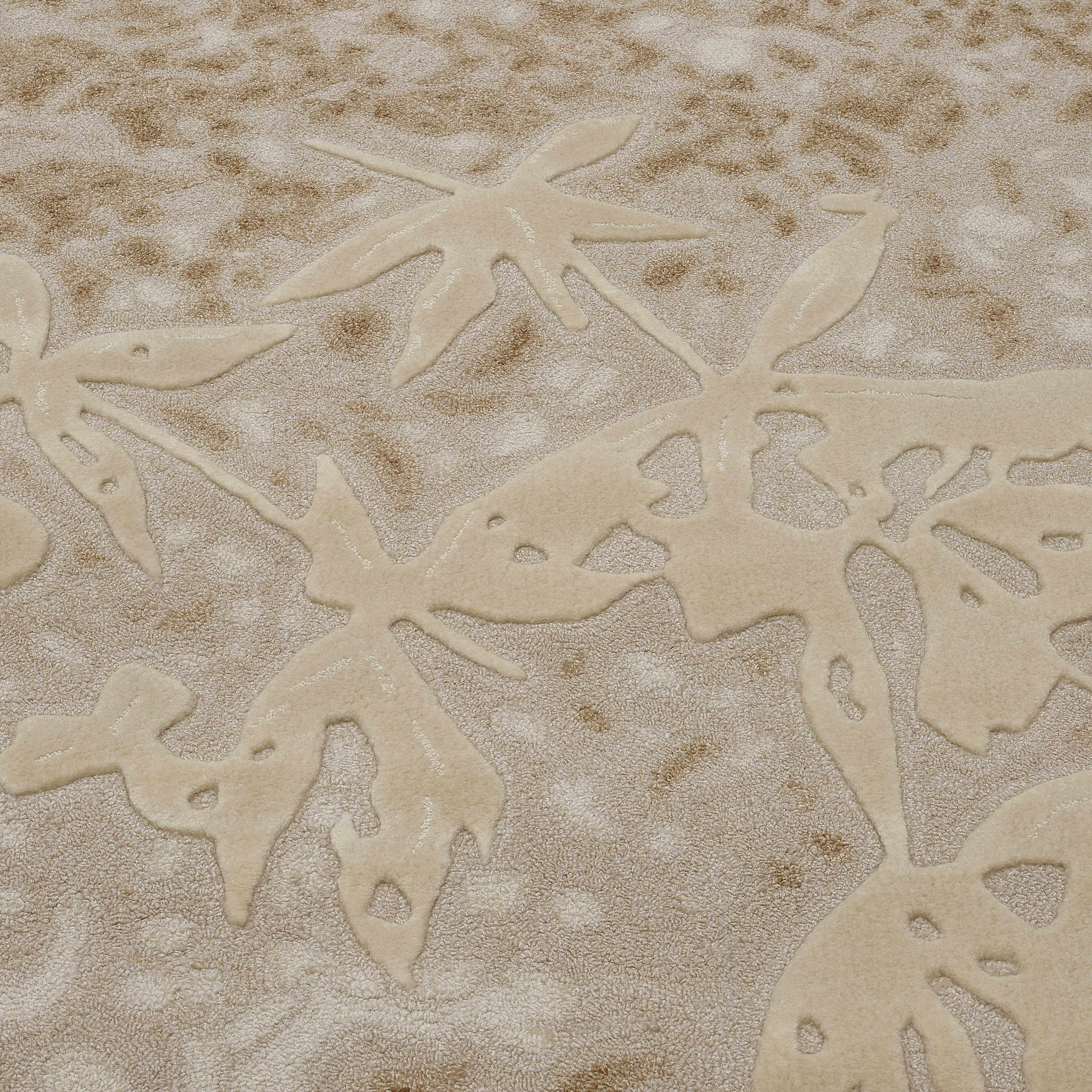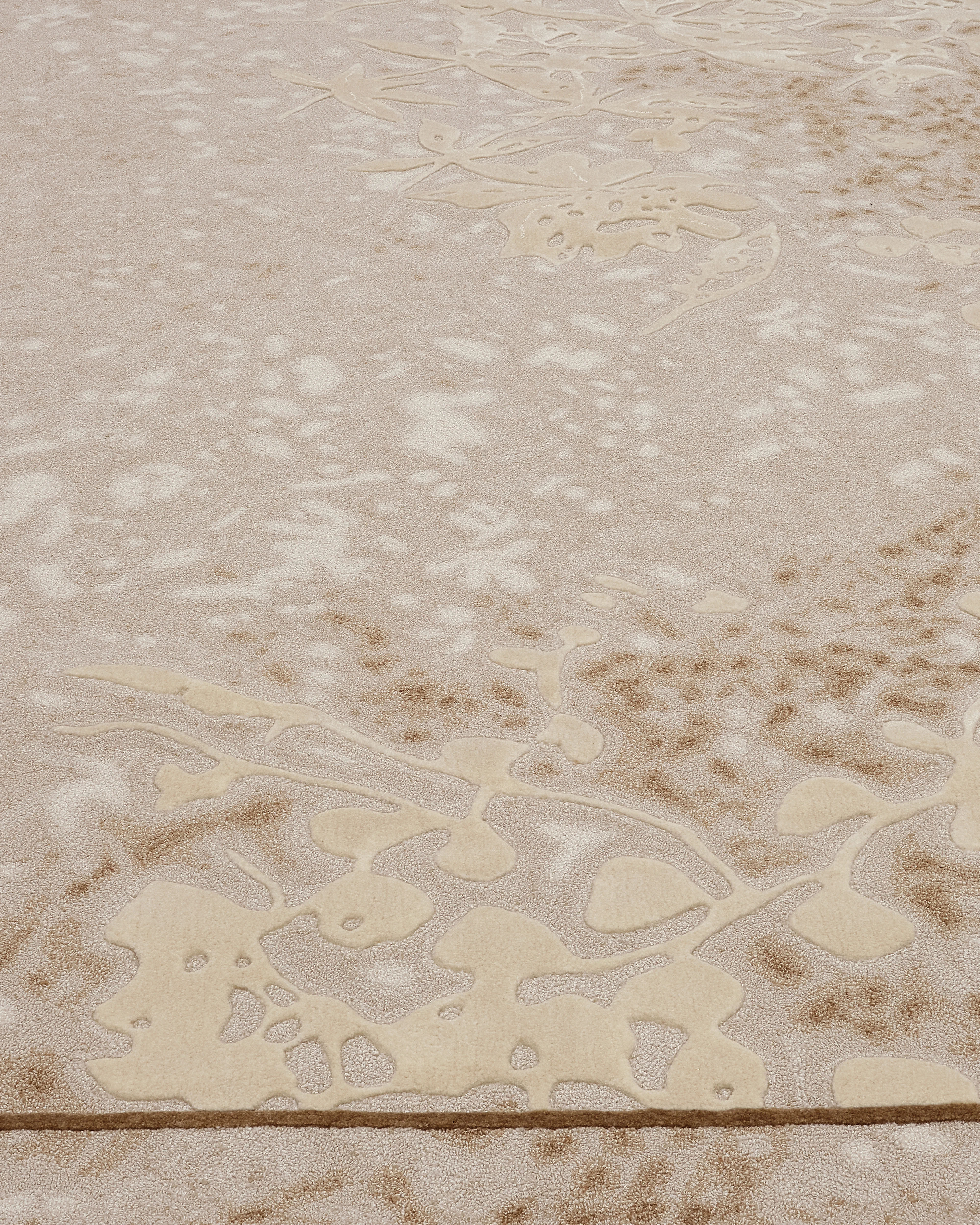 The colour palette of the Embroidery rug includes warm neutrals and soft greys, creating a serene and inviting ambiance. These colours harmonize beautifully, allowing the intricate floral design to subtly stand out while maintaining a cohesive and elegant look.